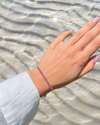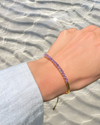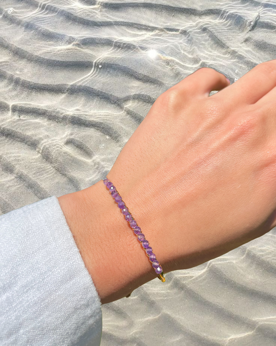 Deze verfijnde, verstelbare armband is met de hand vervaardigd en afgewerkt met een rij subtiel geslepen Amethist steentjes. De dunne gouden band vormt een elegante basis, terwijl de glinsterende edelstenen zorgen voor een zachte en vrouwelijke uitstraling. Dankzij het verstelbare koord sluit de armband mooi aan om elke pols. Het ontwerp is licht, comfortabel en perfect te combineren met andere sieraden of als verfijnd statement op zichzelf.