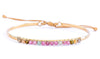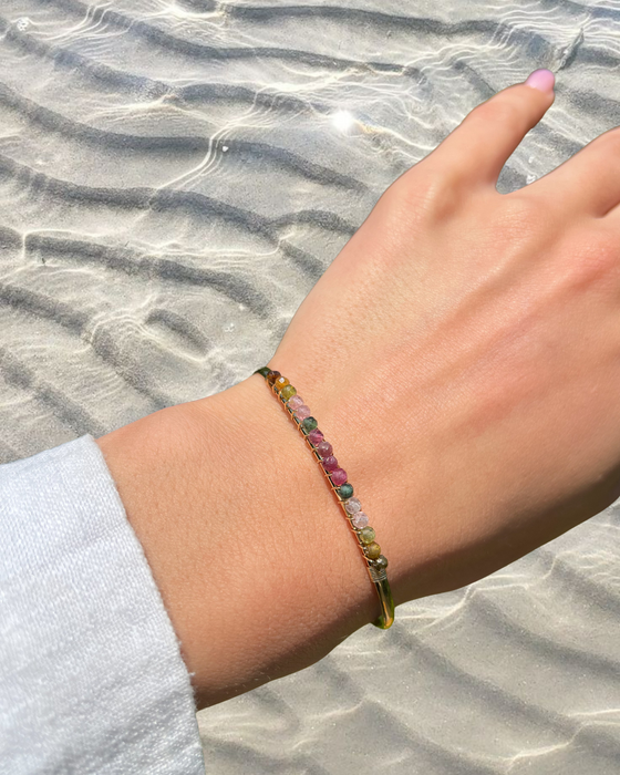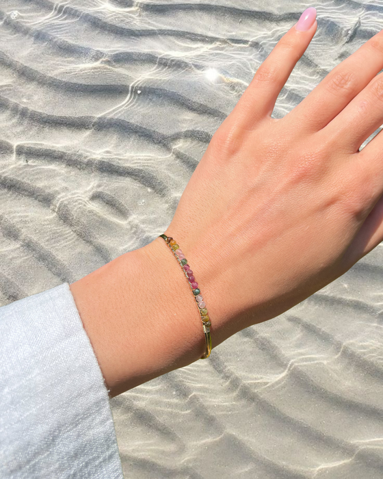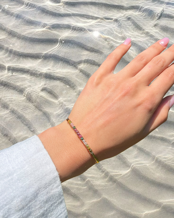 Deze verfijnde, verstelbare armband is met de hand vervaardigd en afgewerkt met een rij subtiel geslepen multicolor Toermalijn steentjes. De dunne gouden band vormt een elegante basis, terwijl de glinsterende edelstenen zorgen voor een zachte en vrouwelijke uitstraling. Dankzij het verstelbare koord sluit de armband mooi aan om elke pols. Het ontwerp is licht, comfortabel en perfect te combineren met andere sieraden of als verfijnd statement op zichzelf.