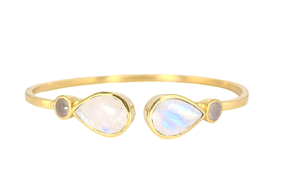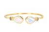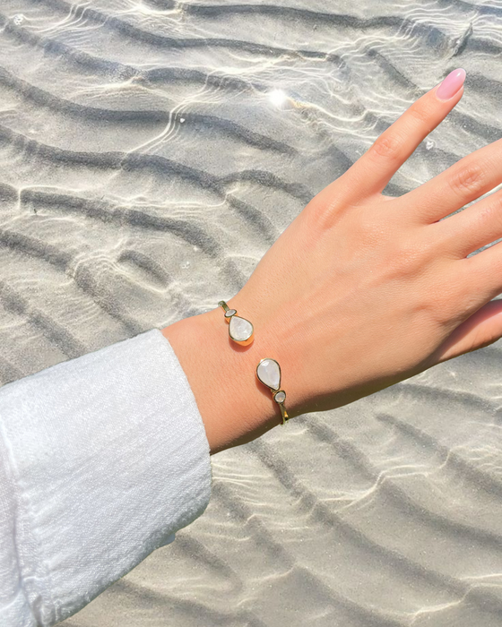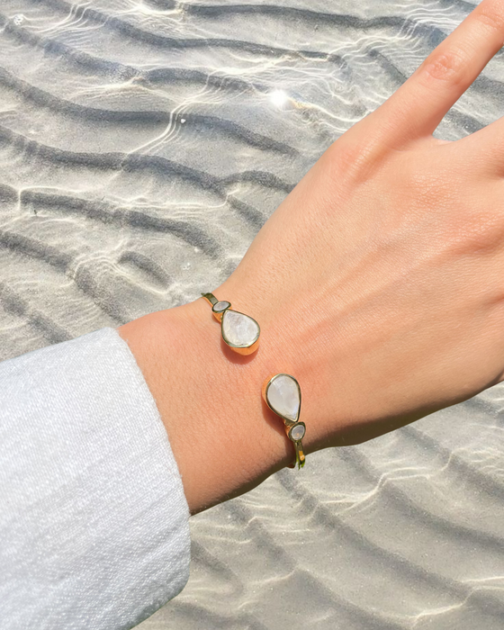 Deze stijlvolle, verstelbare armband is ontworpen voor elke pols en elke gelegenheid. De armband is bezet met twee druppelvormige Regenboog Maansteen en afgewerkt met subtiele Agaat steentjes. Dankzij het open ontwerp past hij comfortabel om elke pols. De warme gouden toon en fonkelende edelstenen zorgen voor een stijlvolle en verfijnde uitstraling – perfect voor dagelijks gebruik of een speciale gelegenheid.